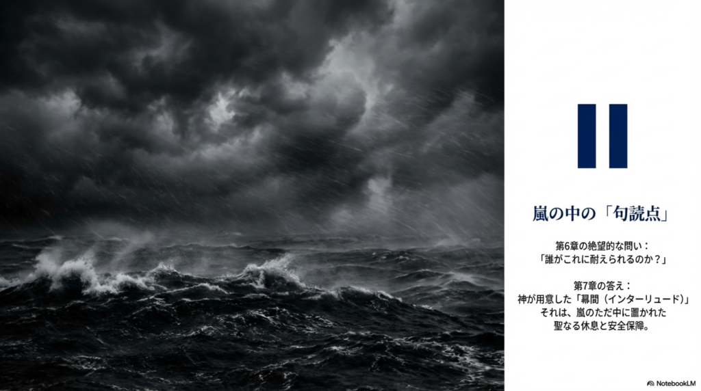 今日お読みする第7章は、その問いに対する神様からの「答え」です。 一言で言えば、「激しい嵐のただ中に置かれた『句読点』であり、神様による安全保障の確認」の場面です。聖書学者はここを「幕間まくあい(インターリュード)」と呼びます。