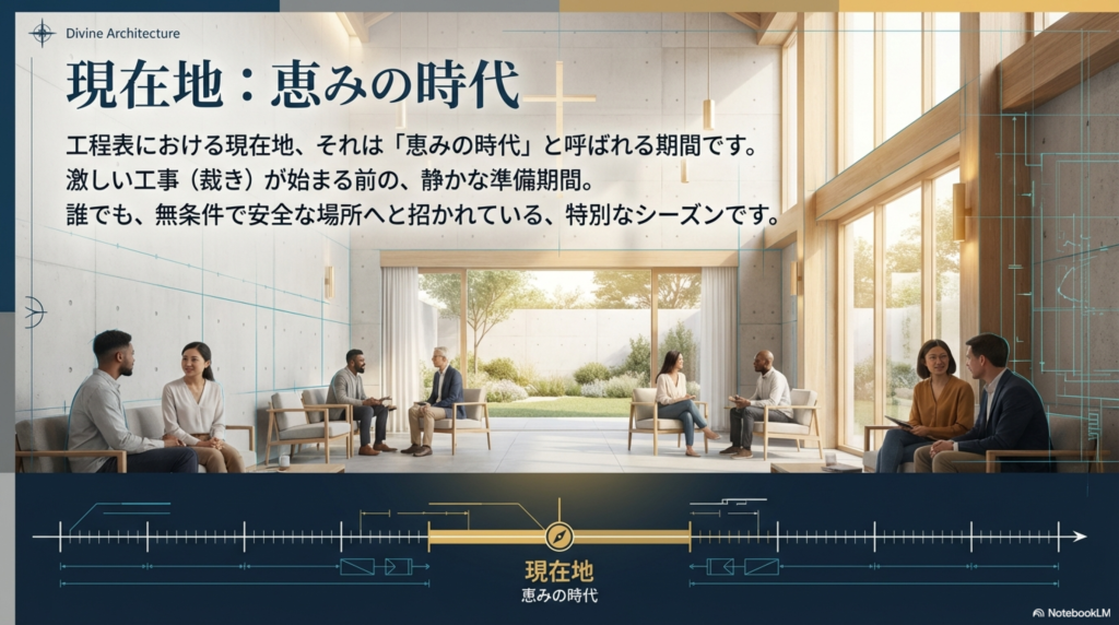 - 現在のステージ:教会の時代(恵みの時代) キリストの復活から約2000年。今は、誰でも自由に福音が伝えられ、信じることができる「恩赦」の期間です。