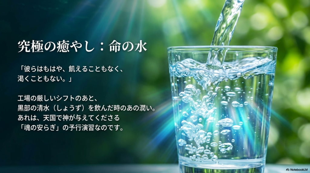 「彼らはもはや、飢えることもなく、渇くこともない。……神が彼らの目から涙をことごとく拭い取ってくださるからである。」