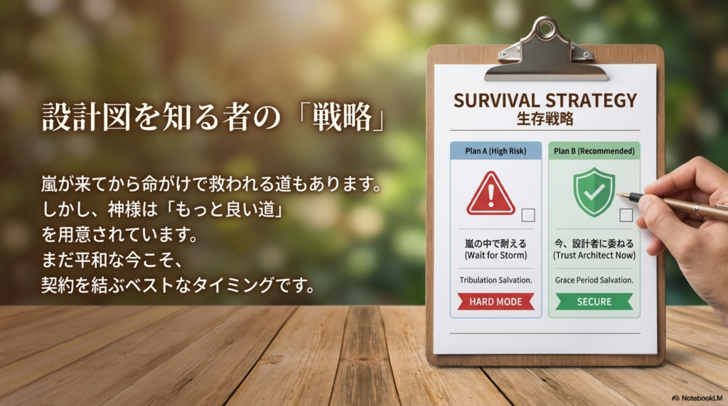 それは、まだ平和な「恵みの時代」である今、イエス・キリストという設計者に人生を委ねることです。