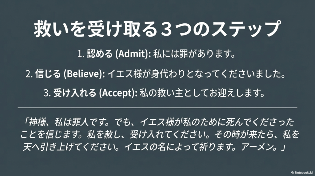 - 受け入れる:イエス様を自分の救い主として心に招く。