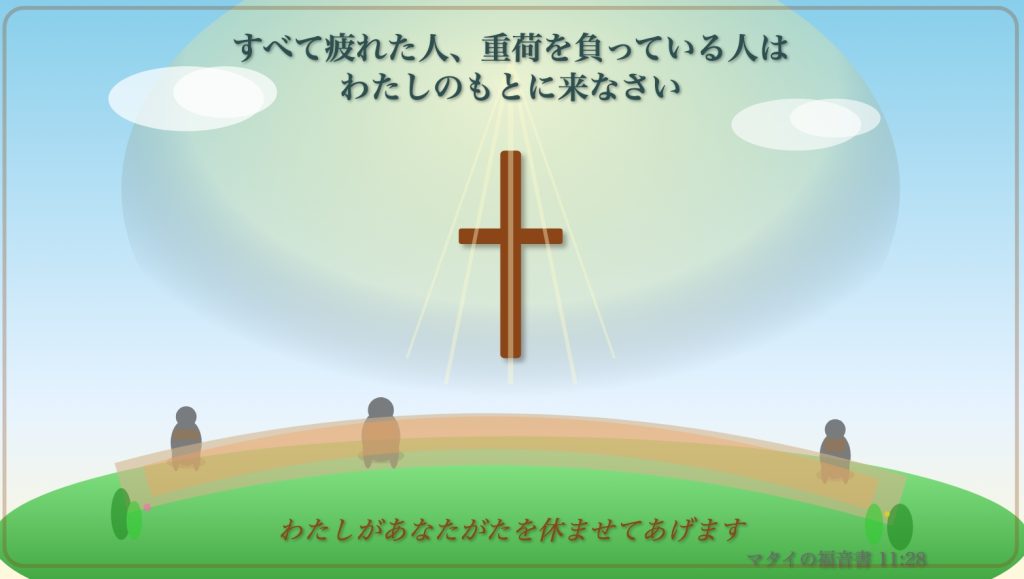 28 すべて疲れた人、重荷を負っている人はわたしのもとに来なさい。わたしがあなたがたを休ませてあげます。29 わたしは心が柔和でへりくだっているから、あなたがたもわたしのくびきを負って、わたしから学びなさい。そうすれば、たましいに安らぎを得ます。