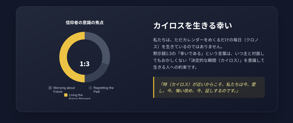 私たちは「あと何年で再臨か?」というクロノス的な計算に陥りがちです。しかし、黙示録が教えるのはカイロスです。「今、この瞬間が神の時である」という緊張感です。
