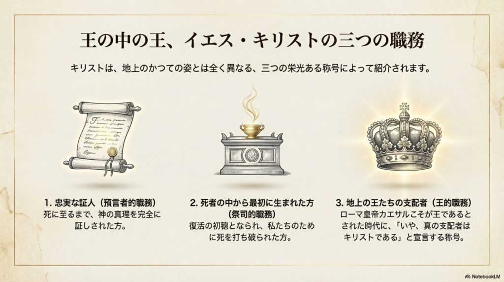 - 「地上の王たちの支配者」(カエサルではなくキリストこそが真の王という王的職務)で呼ばれます。