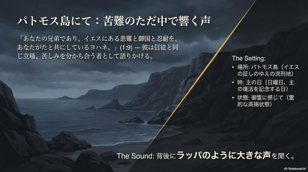 彼はイエスの証しのゆえに、エーゲ海に浮かぶ孤島パトモス島に流刑されており、おそらくドミティアヌス帝の迫害によるものでした。