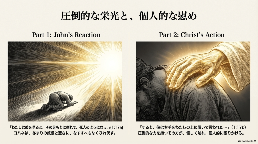 あまりの威厳に、ヨハネは死人のように主の足元に倒れ伏しました。しかし主は右手を置いて励まし、「恐れるな。わたしは最初であり、最後であり、生きている者である。