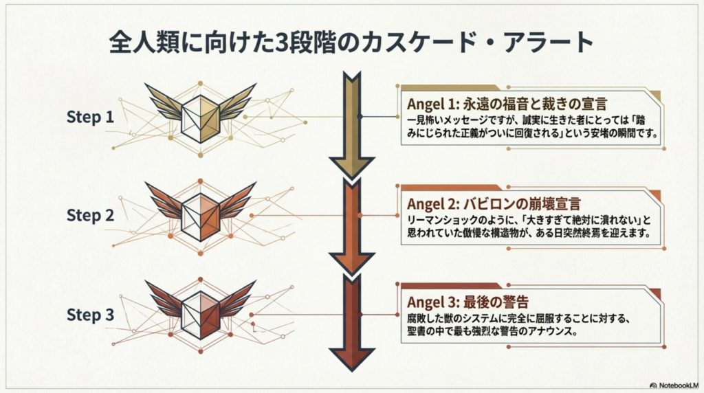 この天使のアナウンスは、「裁きが来た」という恐怖のメッセージではなく、