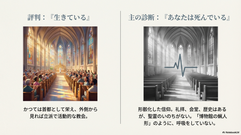 これは「形骸化した信仰(Nominal Christianity)」への警告です。 礼拝のプログラムは洗練され、会堂は立派で、歴史もある。