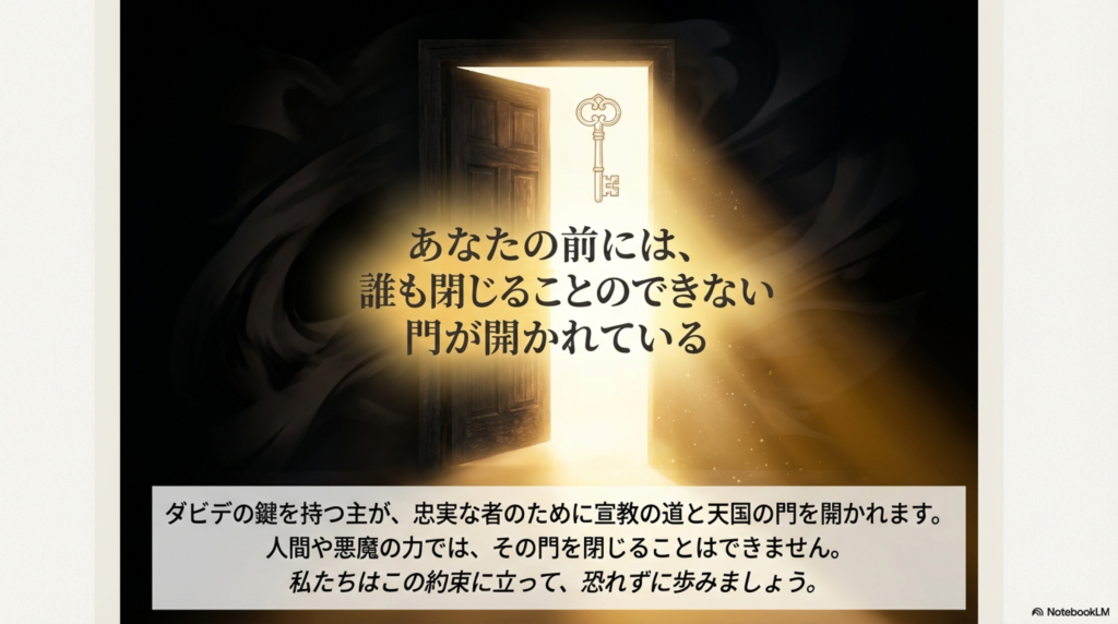 主は、ダビデの鍵を持つ方として、彼らの前に「だれも閉じることのできない門」を開いたと約束されます。
