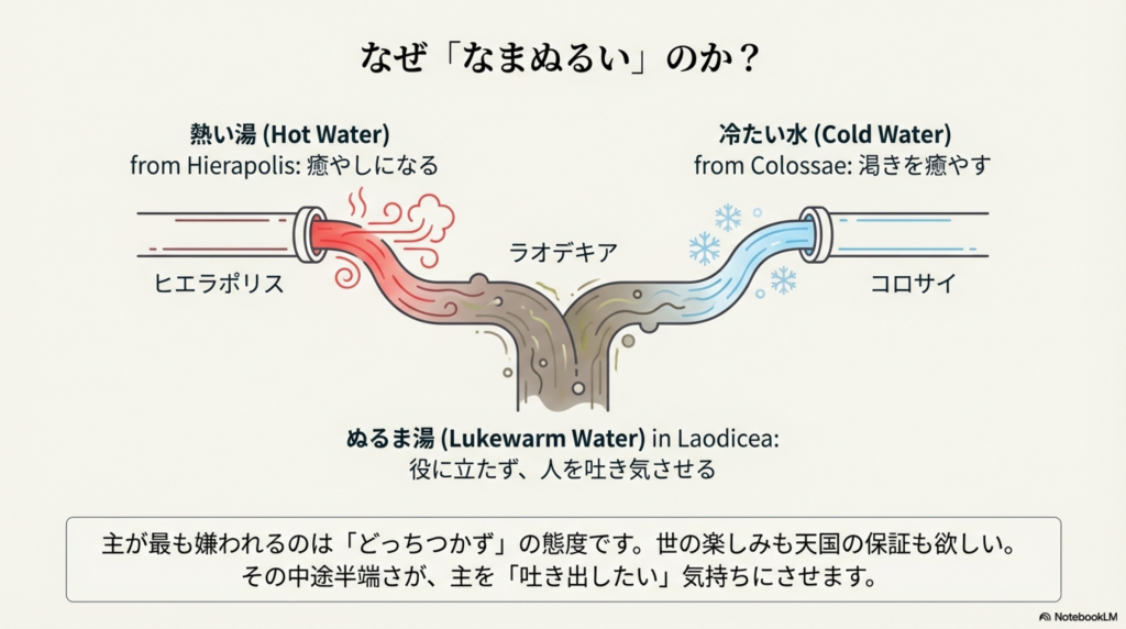 ラオデキアは、近くのヒエラポリスからの「熱い温泉水」と、コロサイからの「冷たい湧き水」が合流する地点でした。
