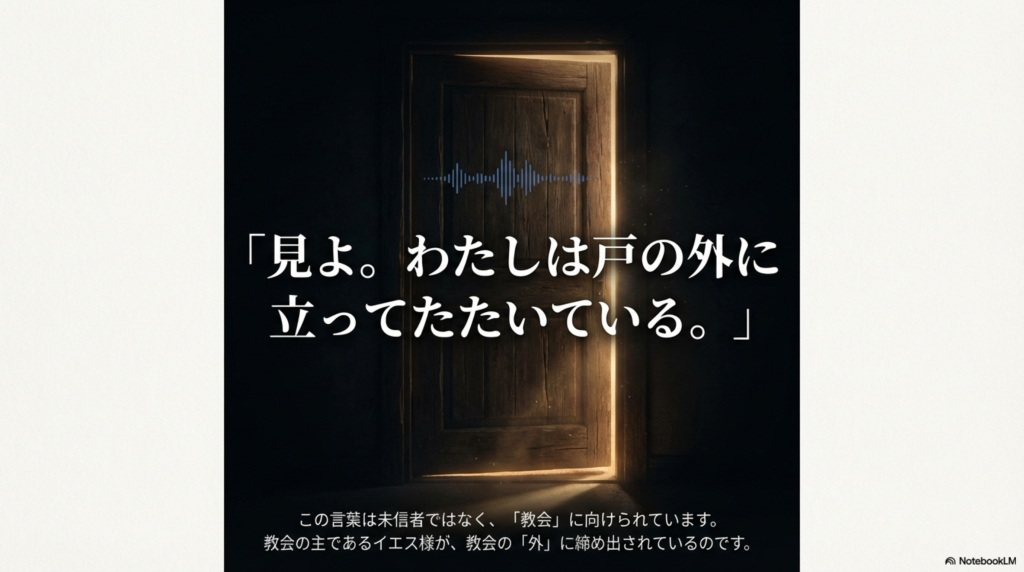 なんと恐ろしい光景でしょうか。教会の主であるイエス様が、教会の「外」に締め出されているのです。