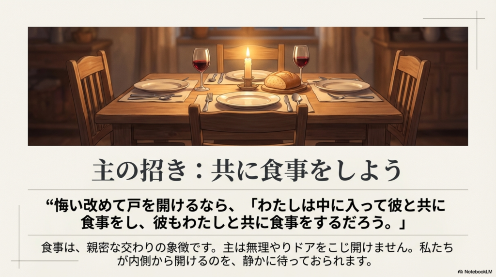 ラオデキアへの約束は、悔い改めて戸を開けるなら「わたしは彼と食卓を共にする」(3:20)というものでした。 食事とは、親密な交わりの象徴です。