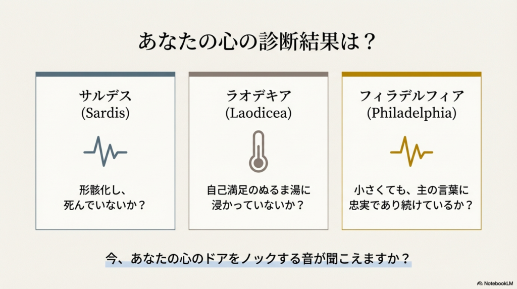 主は、サルデスのように形骸化することを望まれません。 ラオデキアのように、自己満足でぬるま湯になることを望まれません。 フィラデルフィアのように、小さくても、主の言葉に忠実であり、戸を開け続けることを望んでおられます。