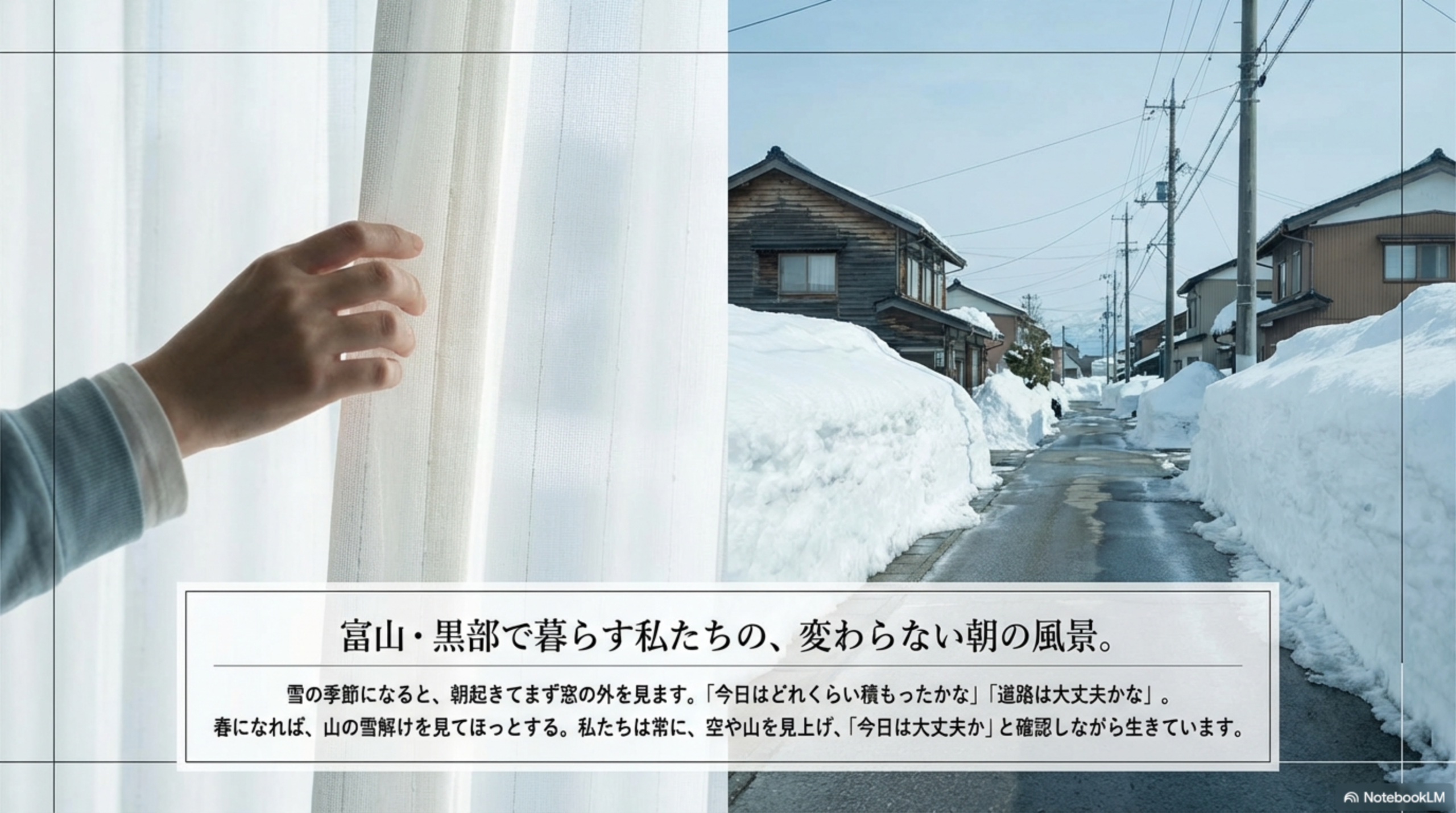 雪が降る季節には、朝起きてまず窓の外を見て、『今日はどれくらい積もったかな』『道路は大丈夫かな』と確認する。