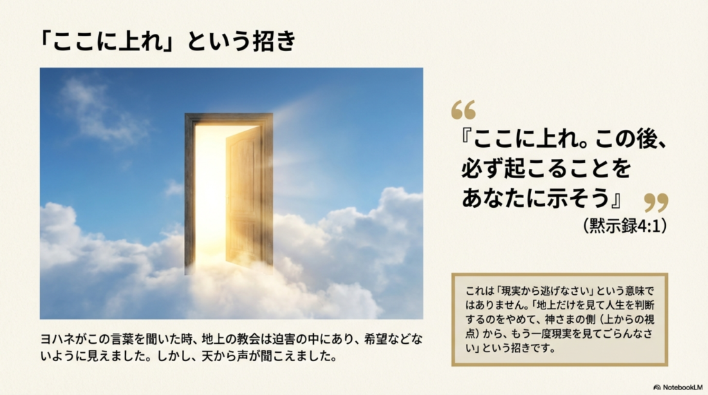 聖書の神は、ヨハネに言われたのと同じように、私たち一人一人にも、『ここに上って来なさい』と招いておられます。